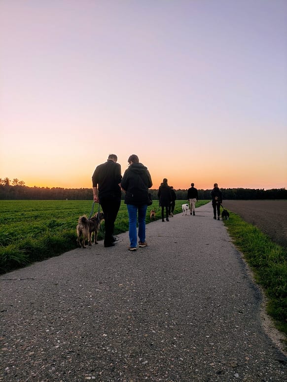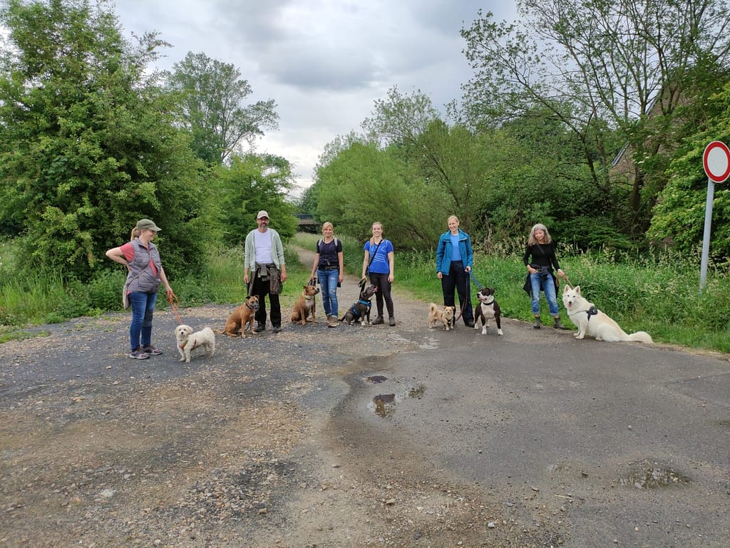 Dafür treffen wir uns in einer kleinen Gruppe von Mensch-Hunde-Teams und gehen mit sicherem Abstand gemeinsam spazieren. Dein Hund bleibt dabei meistens an der Leine und ein Nahkontakt oder die direkte Interaktion mit anderen Hunden ist hier nicht das primäre Ziel.
